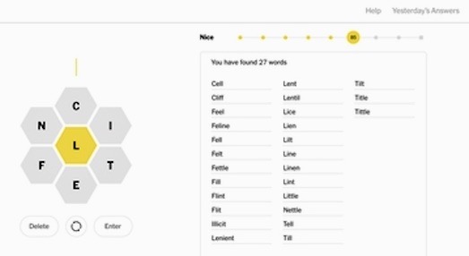 The game presents players with a hexagonal grid of 7 letters arrayed in a honeycomb structure. The player scores points by using the letters to form words consisting of four or more letters. However, any words proposed by the player must include the letter at the center of the honeycomb. Each letter can be used more than once.