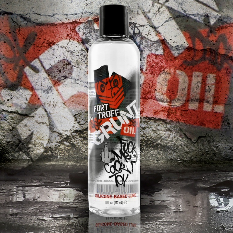 But that’s not what assaulted my eye this morning. It turns out that the exciting feature of Grunt Oil is that it looks like cum. Creamy white jizz. This is supposed to be incredibly hot to Fort Troff’s clientele, and I’m really into cum, but an anal lube that looks like cum strikes me as a goofy idea. Even goofier than dildos scrupulously designed to replicate actual penises. (In both cases, the appeal is to the imagination, not to the senses.)