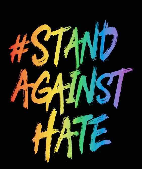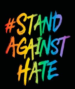 The AHF logo. Meanwhile, yet another ambiguous slogan — Stand Against Hate (and its variant Stand Up Against Hate) has made its way onto clothing (and stickers and the like), via the AIDS Healthcare Foundation. In various letter styles — including pride rainbow, as here: