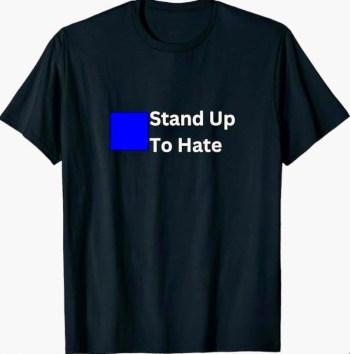 JSB countered that Google offers photos of t-shirts and the like with STAND UP TO HATE. Ah, I had searched specifically for signs, but now with clothing we were in business, with clothing from several reliable sources, just one of which I’ll mention here.