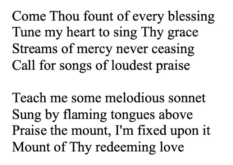 Come Thou fount. Examined in some detail in my 12/23/11 posting “Come Thou Fount”, with its vividly worded text (by Robert Robinson, 1757), beginning: