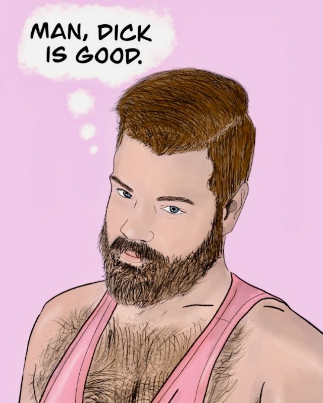 (#3) “Good Dick”: a cartoon portrait (plus the pink tank top), to which any queerboy sentiment could be added in the thought bubble