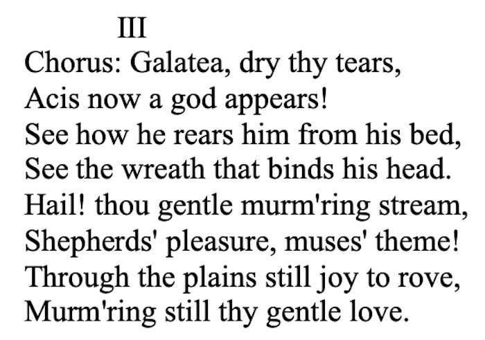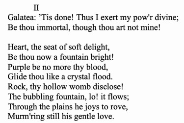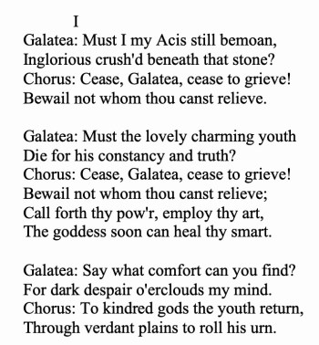 In part I, Galatea declares her grief in three couplets; when she repeats and melodically amplifies each complaint, the chorus answers in counterpoint against her, beginning with the comforting “Cease, Galatea, cease to grieve”, reminding her that she is a goddess and has the power to fix things.