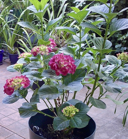 I wrote a little while ago about how my plants had decided that summer was upon them, weeks before summer beckoned on the calendar: the cymbidium orchids went into summer dormancy, and the hydrangea (which flourishes in mid-summer) sent up gigantic flower stalks, quickly crowned by green flower buds that will turn to bright pink.