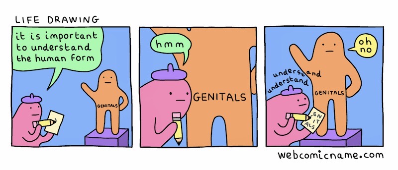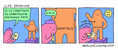 Pointed to Alex Norris’s Webcomic Name — that’s its name — by Max Meredith Vasilatos (to choose her web name) some years ago, I stumbled on his strip LIFE DRAWING of 10/6/17 — about, in some sense of about, genitals — which I’ll display for you in a moment. But first I need to put this strip in context.