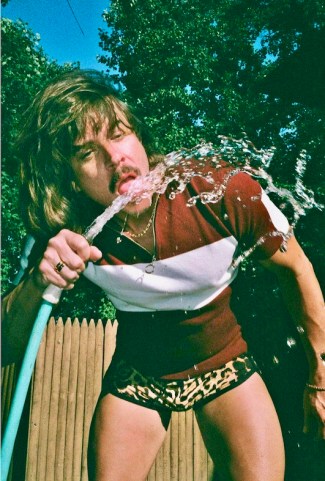 … the hunky way-gay electroclash musician and performance artist, who somehow escaped notice on this blog until a photo from a 2017 Out magazine piece (“Gallery: Wet n Wild With Casey Spooner”) about him popped up on my Pinterest yesterday, with this, um, hose-drinking shot: