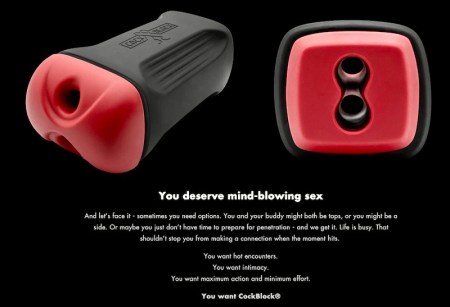 (#1) The company logo: two highly stylized penises, crossed (as in sexual swordplay), plus equally stylized testicles[ad copy:] A new sex toy for two bros: CockBlock® is a hot new way to have sex. Made for two cocks. Do it in the moment. Easy to use and clean. … [a dual masturbation sleeve] designed to combine penetration and frot … enables face-to-face sex right in the moment