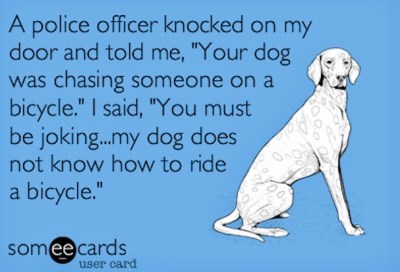 (#1) Did the neighbo(u)r report that some people on a bicycle were being chased by the dog, or that the dog was on a bicycle in pursuit of some people? The human in the photo cartoon supposes the former, the dog the latter