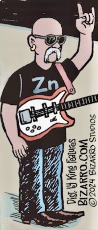 A chapter in the re-working of artistic materials, provoked by my searching for a model for the character Zn in the Bizarro cartoon I posted on yesterday, in “Cu Co Ni & Zn!”, a strip depicting Wayno’s vision of a heavy-metals heavy-metal rock band