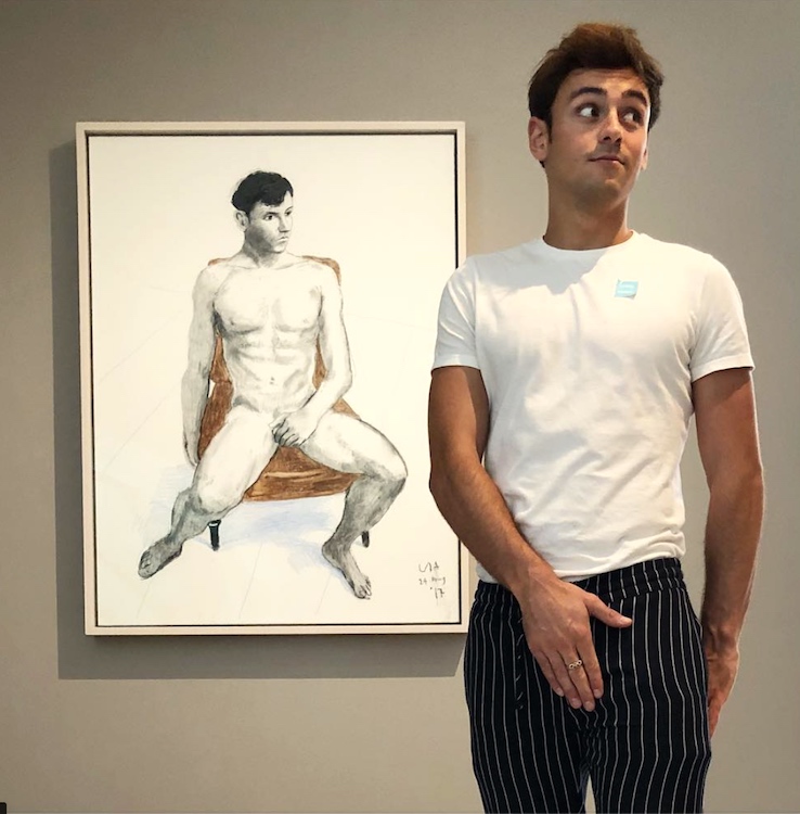 Ah, synchronicity! Yesterday, in my posting “Are You My Bottom?”, I included a section on Tom Daley and his husband Dustin Lance Black — partly for the sake of a shot of Daley cradling Black’s bottom as they walk on the street, and partly for the sake of a shot of Daley’s bottom in very brief Speedos. Then today from Randy McDonald on Facebook, a Hornet website story from the 24th, “But Is it Art? Tom Daley Poses Nude for Painter David Hockney” by Dan Avery, the centerpiece of which is this photo by Black, of Daley guying for the camera in front of Hockney’s painting of him: