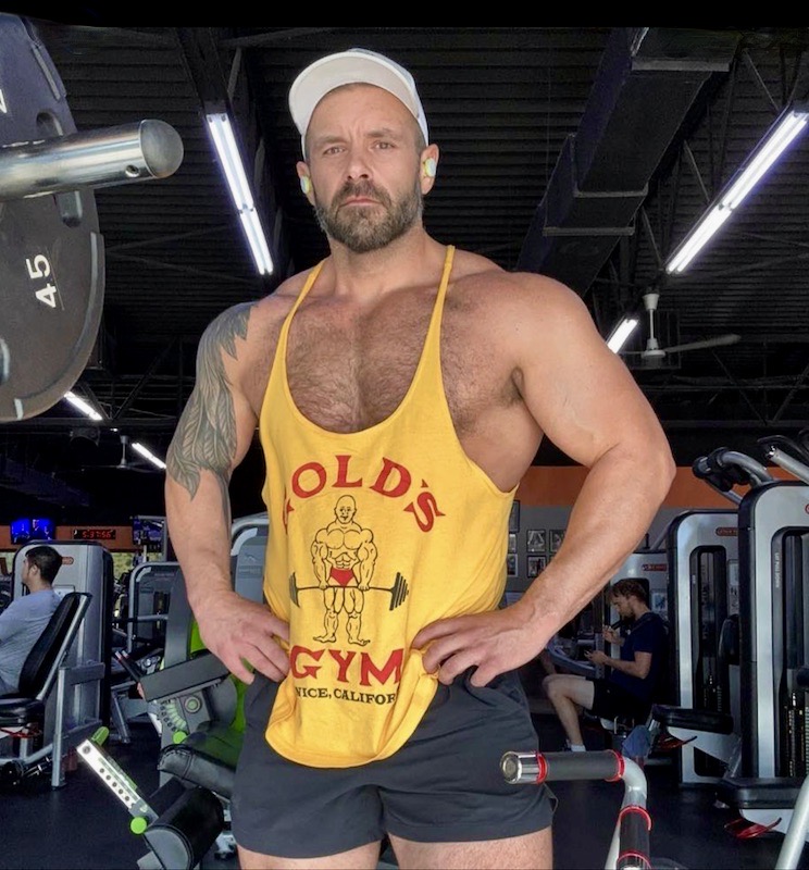 Indeed very hot; Bill suspected at the outset that the guy was too expensive for him, and that was surely the case when he was available as a rent boy, back when he was a feature at gay parties; and probably still now, when he sells himself virtually on the OnlyFans site while continuing to act in gay porn: 16 episodes of Raw Fuck Club and in such videos as Power Play (2022), Big Load Movers (2022), Sweat. Fuck. Repeat (2023), and Fan Male (2023). He’s an admirably hard worker, thoughtful and self-reflective, and he’s turned himself around after an incandescent youth fueled by drugs and alcohol; he’s still a sex worker, not always an easy career, but he seems to be on top of things. He’s even engaged to another man, Todd Wing, who is (like CM) also an amazing muscle-hunk (photo to come).