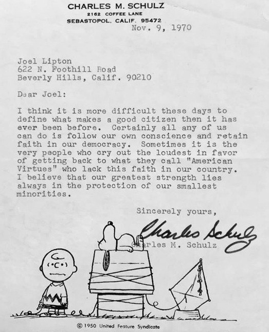We contacted the author, Joel Lipton, whose sister had posted the letter on Facebook. Joel said that he wrote the letter to Mr. Schulz when he was 10 years old in 5th grade. It was 1970, and his memory of the assignment was for the students to write a letter to someone they admired and ask the question, “What do you think makes a good citizen?”.