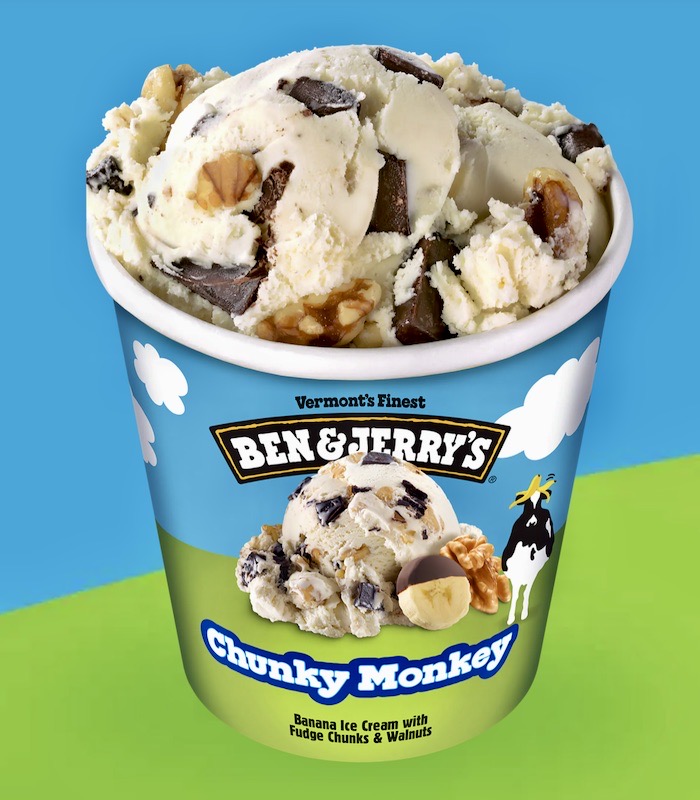 (#3) According to B&J’s, Chunky Monkey is banana ice cream with fudge chunks & walnuts: the fudge chunks make the ice cream chunky; and the banana content provides an allusion to monkeys, who are famously fond of the fruit