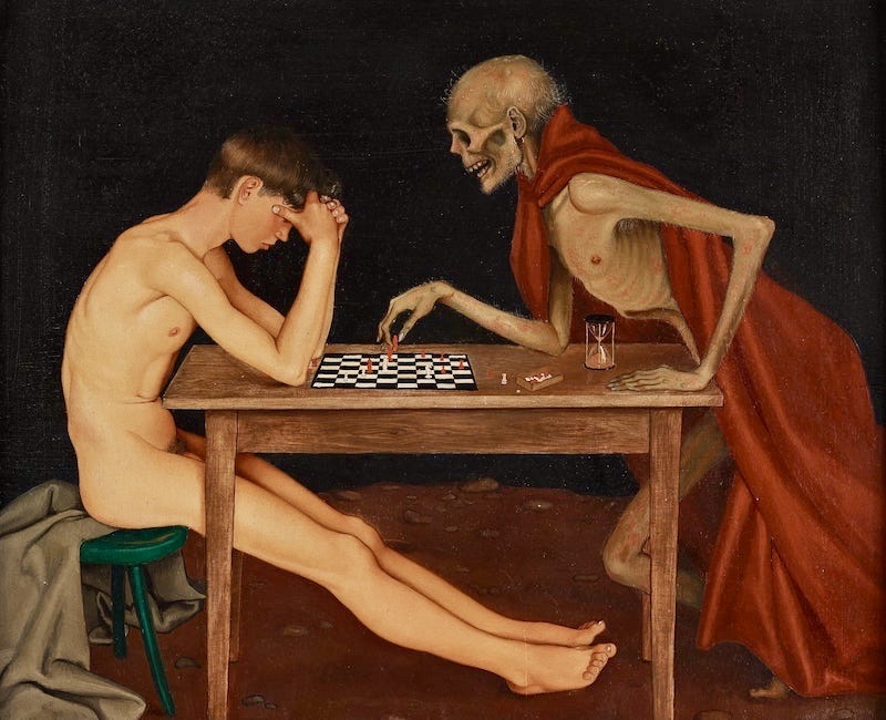 (#3) Young, lean, and naked in the presence of DeathThis painting … by Owe Zerge depicts a young, nude man seated at a table, deeply engrossed in a game of chess. His opponent is a skeletal figure, symbolizing death, wearing a tattered red cloak. The background is stark black, highlighting the two figures and the game, which serves as a metaphor for the man’s struggle against mortality. Death’s bony hand moves a chess piece, suggesting it’s his turn, while an hourglass on the table hints that time is running out. The overall mood of the painting is somber and reflective of the existential themes of life and death.