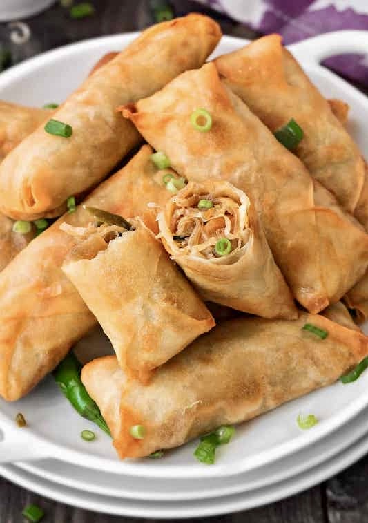 Mainland China: Spring rolls are a seasonal food consumed during the spring, and started as a pancake filled with the new season’s spring vegetables, a welcome change from the preserved foods of the long winter months. In Chinese cuisine, spring rolls are savoury rolls with cabbage and other vegetable fillings inside a thinly wrapped cylindrical pastry. They are usually eaten during the Spring Festival in mainland China, hence the name. Meat varieties, particularly pork, are also popular. … They are fully wrapped before being pan-fried or deep-fried.