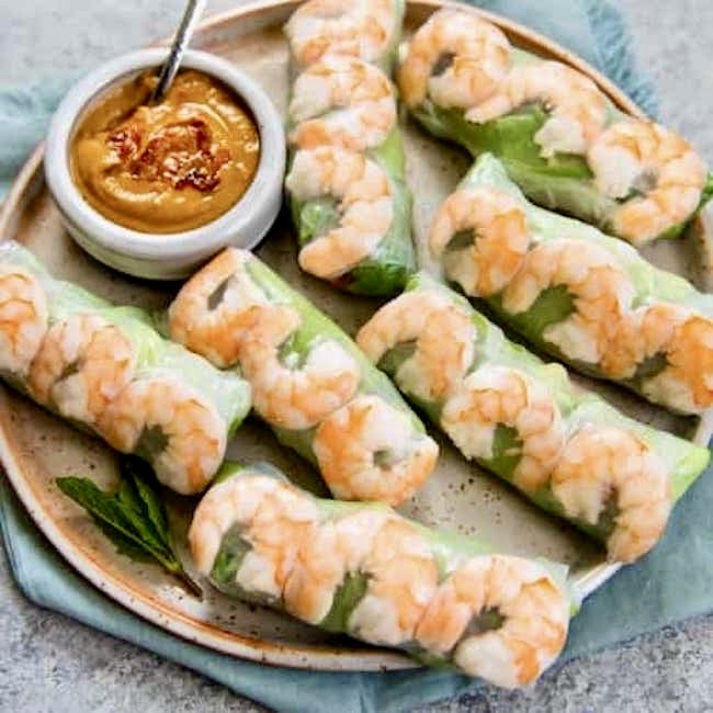 (#3) From the Healthy Nibbles recipe site: Vietnamese fresh spring rolls,Ā made with shrimp, vegetables, herbs, and rice noodles wrapped in rice paper, and served with peanut sauce for dipping
