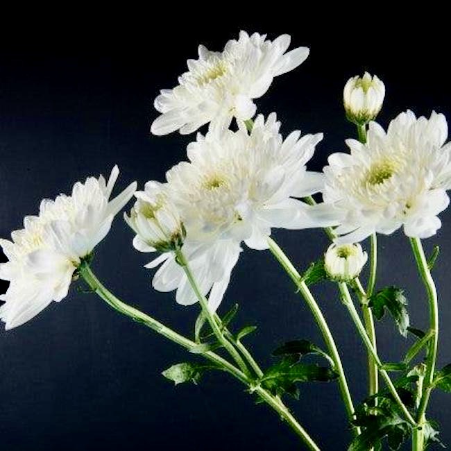 The chrysanthemums. A traditional late-summer flower in the garden, and a reliable cut flower, coming in many forms and colors. The ones in León’s bouquet are the simplest of ray flowers, as here: