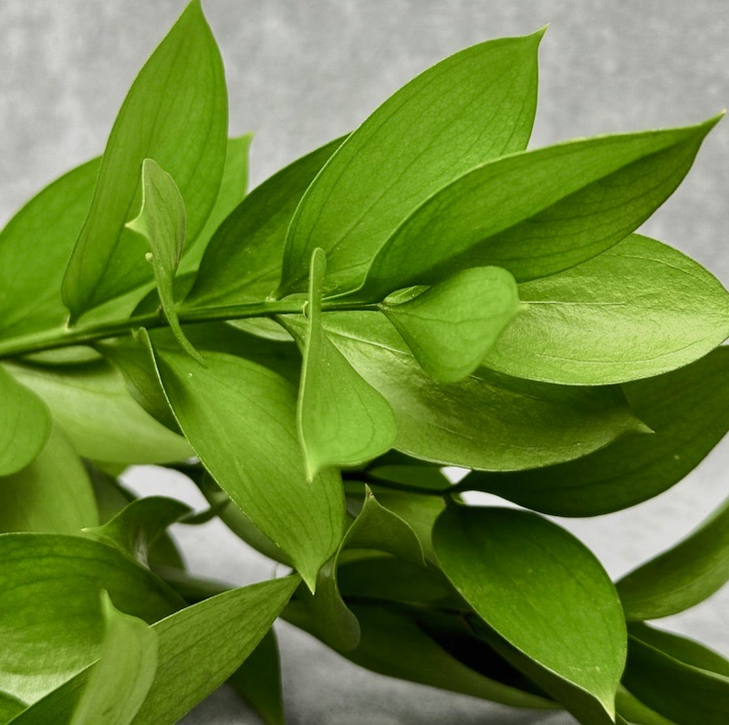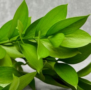 Glossy green leaves. Probably some variety of Ruscus foliage, widely used in floral displays, as here: