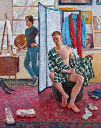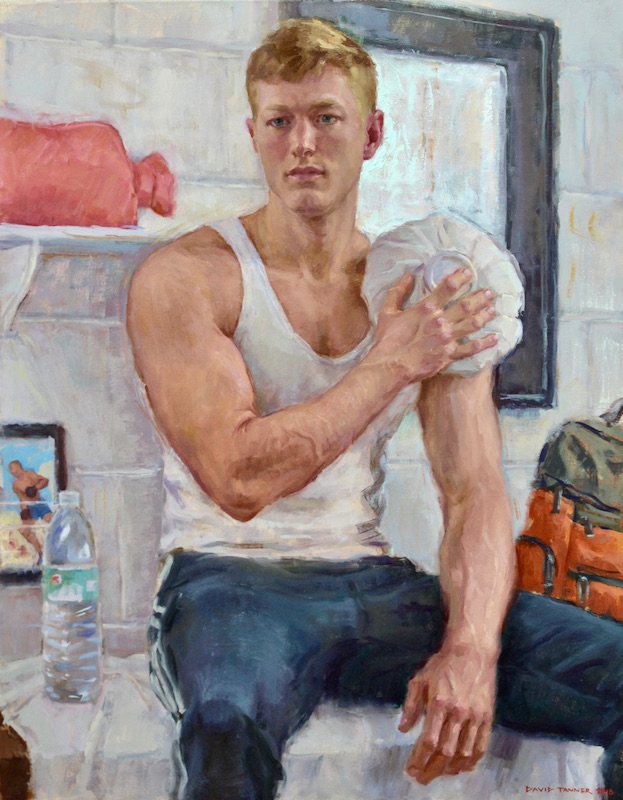 (#1) Model Break (2016), which attracted my attention for its interest in the male body, also because it’s an example of modern representational painting by a serious artist, in one of the forms (portraiture) where this traditional approach flourishes (other such forms: still lifes, nudes, landscapes, and magic realism and fantasy — all of which, except the last, Tanner has also taken up)