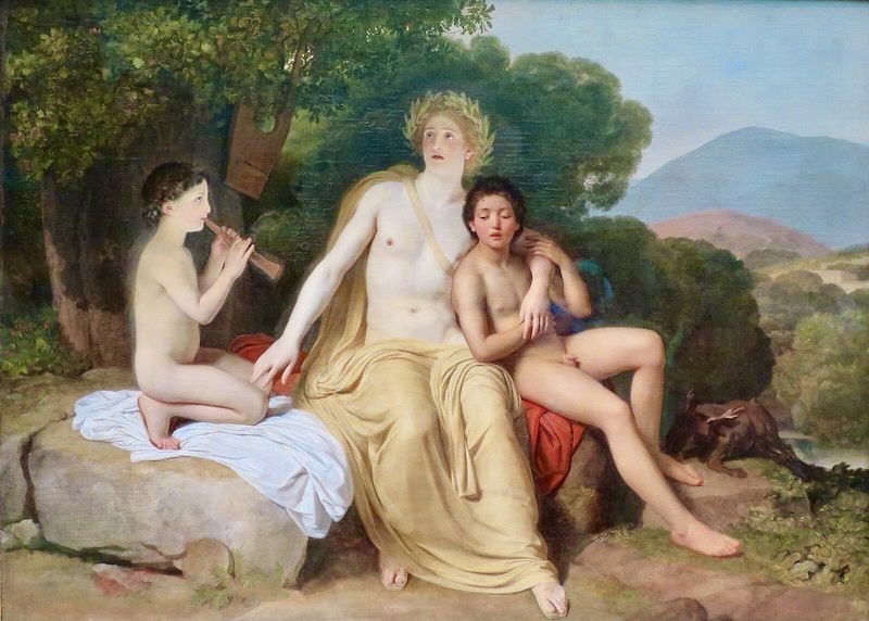 A gauzily Romantic painting, set in a rough scenic wilderness, apparently of some classical or mythological subject in which music plays a significant role. Ok, so the beautiful young man is probably the god Apollo, famously skilled at the lyre (bonus: by far my favorite of the pantheon of ancient Greece and Rome). In this painting as the god of music and also the protector of the young. The boys are naked because they are true pre-pubertal innocents. Or just because the scene is set in the Arcadian wilderness, suffused with divine presence, a territory in which the gods and those within their aura have no need for the garb of ordinary mortals. Well, certainly not in artworks; consider the famous Apollo of the Belvedere statue (my 9/23/24 posting “Godlike beauty” has a section on the Belvedere Apollo and his full-frontal divinity).