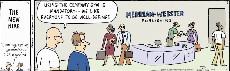 The 11/12 Piccolo / Price Rhymes With Orange strip takes us to the Merriam-Webster company gym, where the lexicographers get defined: