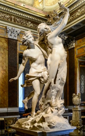 (#4) The statue in the Galleria Borghese in Rome, where it’s housed along with several other examples of the artist’s most important early worksApollo and Daphne is a life-sized marble sculpture by the Italian artist Gian Lorenzo Bernini, which was executed between 1622 and 1625. It is regarded as one of the artistic marvels of the Baroque age … The sculpture depicts the climax of the story of Apollo and Daphne …, as written in Ovid’s Metamorphoses, wherein the nymph Daphne escapes Apollo’s advances by transforming into a laurel tree.