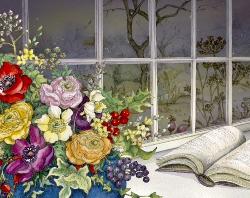 A Window to Winter. A Jacquie Lawson digital greeting card (from Helen Aristar-Dry and Tony Aristar) that gradually assembles a vase of flowers on a windowsill — “observe a beautiful wintry scene from a warm and cosy windowsill”, says the Lawson site — while the Polovtsian Dances from Borodin’s 1890 opera Prince Igor — specifically, the “Gliding Dance of the Maidens”, which was transformed into the song “Stranger in Paradise” from the musical Kismet (1953) — plays in the background. The flowers, fully assembled: