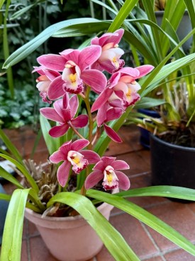 Did some garden work with [my caregiver] León [Hernández], but not as much as intended, ’cause it’s cold. On the other hand, two cymbidiums [cymbidium orchids], of different colors [red, well reddish-brown, and (lemon) yellow], are now in full bloom, with more stems shooting up all the time. L views the whole thing as a little miracle and is much delighted. Got him to move the flowering ones so that I can see them from my work chair.