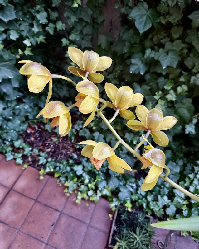 On the red (and my other winter-blooming cymbidiums), see my 2/25/11 posting “Rough winds”. The reddish-brown one was the  first of them, a birthday present from me to my man Jacques in January 1986 (and has since been divided into clones many times). The yellow one came along later; it’s always the first to bloom. Traditionally, it was the herald of the new year, but it’s been opening up earlier and earlier as the years go by. I’ve taken to calling it Rogue Yellow.  Last year it was fully open by mid-December. This year, as reported in my 11/26/24 posting “Rogue Yellow for Thanksgiving Eve Eve”, it was even earlier.