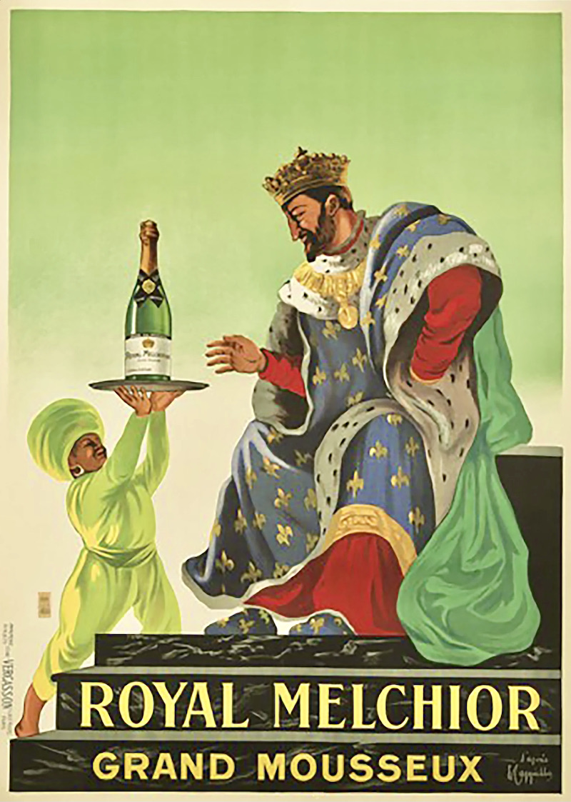 [2022 caption:] The Magus Melchior, roi des Perses, serving as advertising eponym and mascot for Royal Melchior vin mousseux (sparkling wine), in a poster (undated, but from early in the 20th century) by Leonetto CappielloThe royal Melchior in [this poster] is young, broad-shouldered, and virile, not the graybeard of traditional representations. Also powerfully royal: with a crown and pendant of gold, a basic garment in the crimson of royalty and nobility, and over all of it royal robes of France, with an ermine collar and a bleu de France fabric emblazoned with the gold fleurs-de-lis of French royalty. This Melchior is not just any king; he’s the (mythic) king of France.