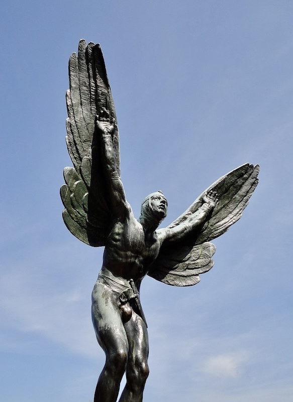 The aviator is presented as a nude because this a representation of a hero, and in the tradition of Western artworks, heroes and gods can be viewed as above and beyond clothes (Michelangelo’s David being the most famous example); their exposed genitals are never a focus of attention (our eyes are on the faces and the musculature), but are just there, part of the whole male package.