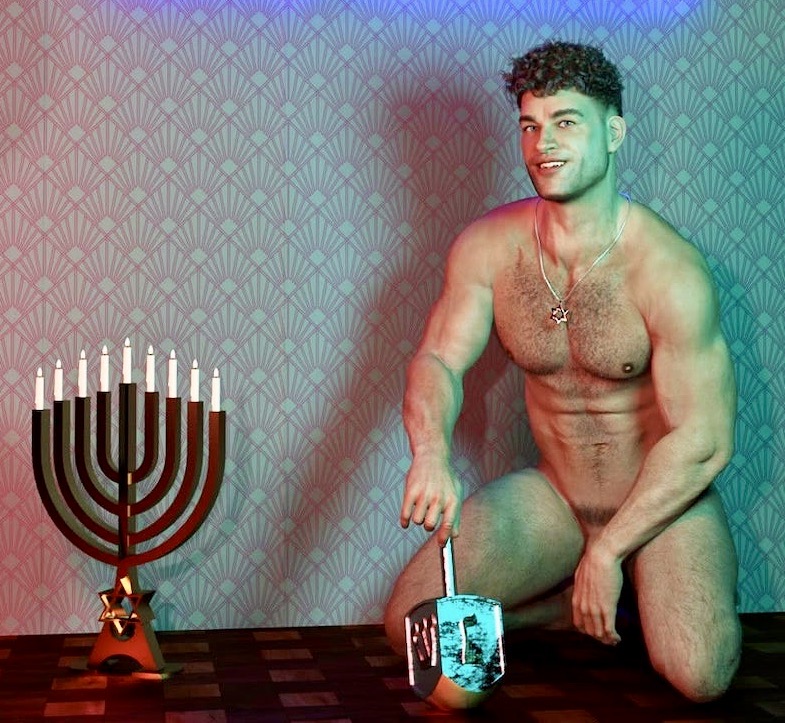 The image is an AI composition by my friend Vadim Temkin (whose artwork is often featured on this blog). The hunk is doing a crotch tease, just barely concealing his junk. Meanwhile, the menorah is (merely) ample; the dreidl, however, is gigantic — a typical dreidl is less than 2ā³ top to bottom; large dreidls for sale are around 3ā³; the one in the image looks to be about 10ā³, and heavy enough to club baby seals with (more like a weapon than a toy).
