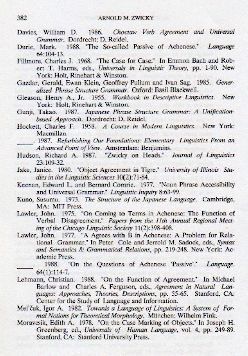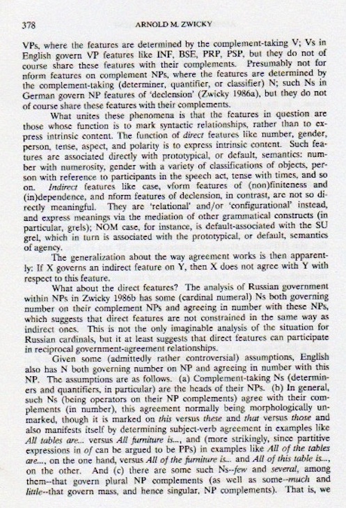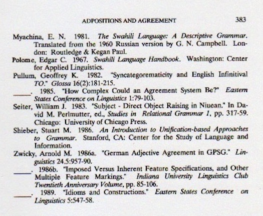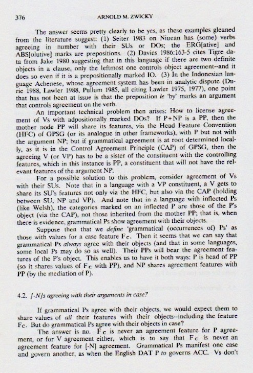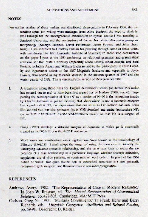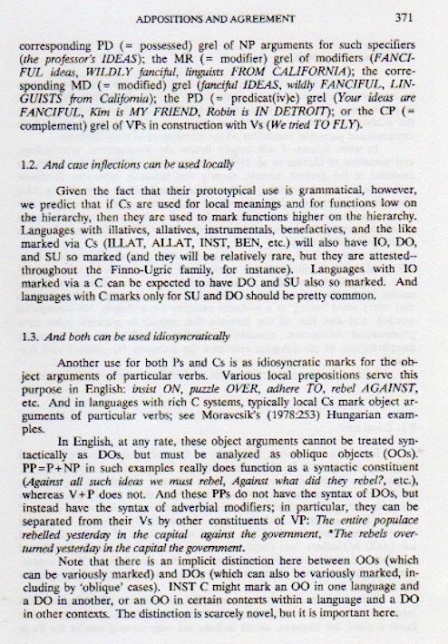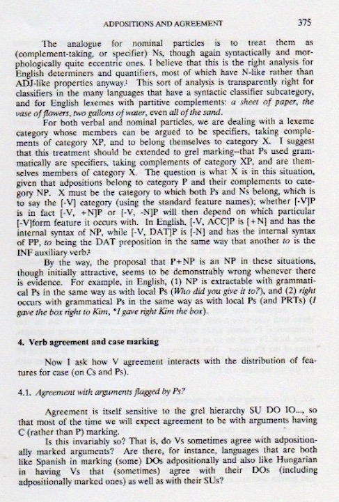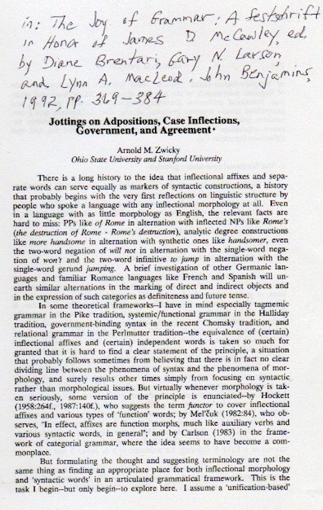 There was this paper of mine (“Jottings on Adpositions, Case Inflections, Government, and Agreement”), originally from 1988 but not properly published until 1992 (in The Joy of Grammar: A festschrift in Honor of James D. McCawley), that I wanted to quote from in an on-line discussion a week ago, only to discover that after the great dispersal of almost all my books and files some years back, I had no trace left of the thing, no copy of any kind (this sort of thing keeps happening to me). I couldn’t find a way to get a copy on-line, but in a stroke of luck it turned that Benjamins was selling off its remaining stock of the paperback edition of Joy at a price I could actually afford, so I bought their last copy and had it mailed to me next day delivery. This morning I created jpegs of all 15 pages (369 through 384); the quotation I need is on the first page, but now I can add this posting of all 15 pages to the little set of publications of mine available on-line.