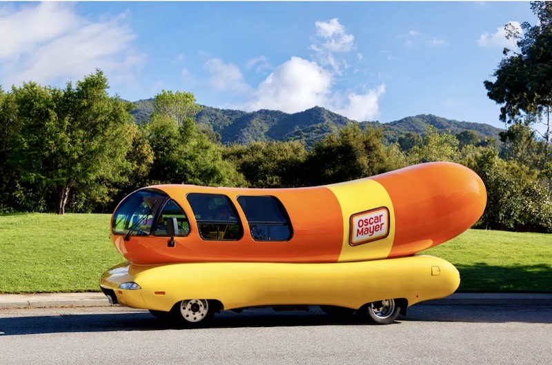 Now, I’m a Pa. Dutch sausage-oriented guy, though I have a hot dog / frank(furter) ritually on my country’s Independence Day, but that’s a kosher frank rather than your standard Oscar Mayer product. I’ll eat an Oscar Mayer dog amiably if offered one, but I don’t seek them out. Nevetheless, I love the idea of the Wienermobile. Seen in this photo on the road: