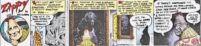 In today’s Zippy strip, our zany, happy-go-lucky Pinhead finds himself drawn to dark imagery in art: in the wartime horrors of Picasso’s Guernica, in the monster within Albright’s Dorian Gray: