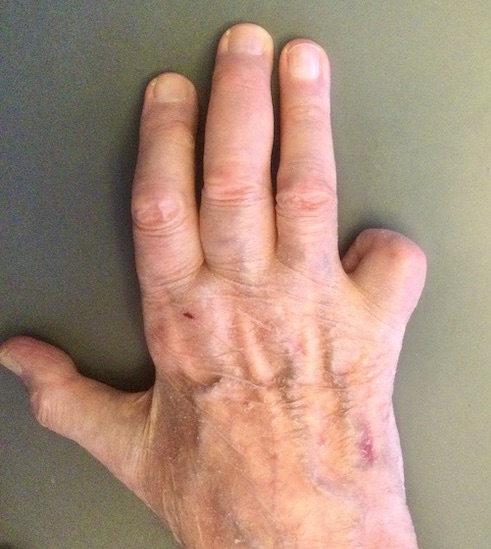 Here is J’s picture, somewhat blown up for maximum effect (as extras, you get my swollen middle finger, my inert little finger, and the muscle wasting between my thumb and index finger — I have become adept at positioning my hand in public so as to draw observers’ attention away from these defects, so that most people don’t notice them):