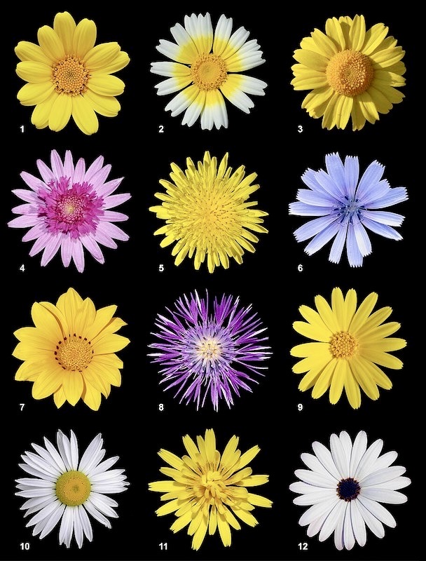 A poster of twelve different species of flowers of the family Asteraceae, belonging to the three most representative subfamilies: Asteroideae (Ast), Cichorioideae (Cich) and Carduoideae (Card):