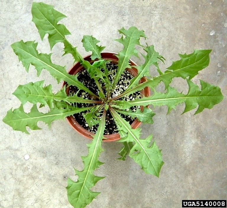 (#2) Leaves of the mature common dandelion, Taraxacum officinale (photo by Lynn Sosnoskie via University of Georgia, Bugwood.org), from the Cornell Weed Identification site