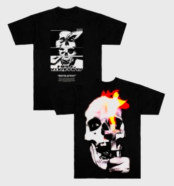 Text from the company: This tee delivers a raw message: “Death to Ignorance.” The front features fractured imagery symbolizing distorted truths, paired with the word “Revilation” as a bold call to awareness. The back erupts with a flaming skull gripping a cross, embodying the destruction of old beliefs and the rise of new perspectives. A statement of rebellion and clarity.