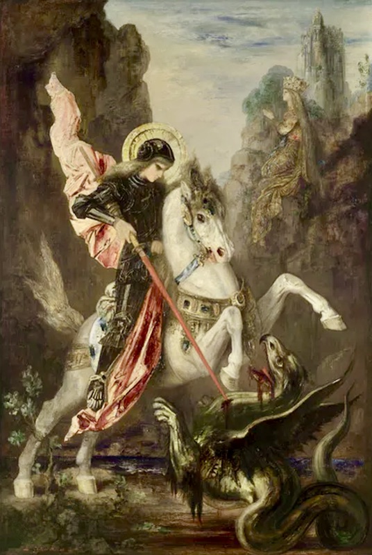 The drama of St. G. and the princess-devouring reptile has been depicted by vast numbers of artists, but I especially admire Gustave Moreau’s complex composition, with its vivid, detailed foreground — a young and beautiful but also fierce (but also saintly too) George lancing the fearsome beast, while his crazed mount rears back — and with a misty, sketchy princess and her idealized castle receding into the background: