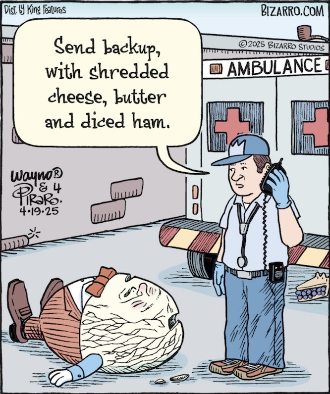 The cartoonist is bob, whose full name is Bob Eckstein, and the one-panel gag cartoon in question is a very recent one (from the May 2025 issue of Funny Times) and a pointedly topical one — and I greatly admire it: