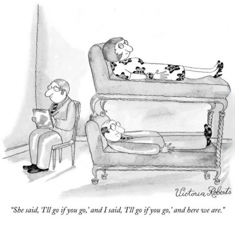 The couple cartoons. A gigantic theme in VR’s cartoon world is the domestic life of couples. On at least one occasion, she’s managed to put the couple in an analyst’s offi ce:
