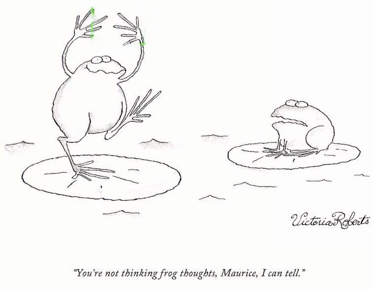 Froggy goes a-toonin’. VR is (at least in recent years) into frogs. Three more of her frog-themed cartoons in the New Yorker; they’re all about Schadenfroggy (or else all talking frogs look alike):