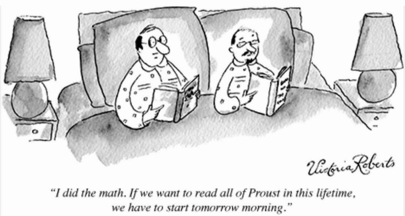 (#6) This is, of course, a Proust cartoon, and a gay life cartoon (William Haefeli could have done a version of this with one of his NYC gay couples), and a passionate reader cartoon, and probably several other things as well