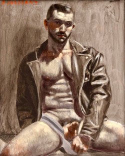 The leather-jacket paintings of Bruce Sargeant. Leather jackets, sometimes jockstraps, sometimes big butch boots, either ass or dick. I start with the painting that provoked this posting: