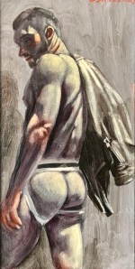 Pinterest has been offering me this painting every so often for a long time, but without any identification; today, I was finally intrigued enough by the tough and direct offer of the model’s muscular ass for sex to use Google Images to dig out the source. Who turned out to be an artist we’ve seen on this blog before, in my 7/18/23 posting “A homerotic painting by Bruce Sargeant” (the painting is Locker Room Scene — Charlie in Three States of Undress).