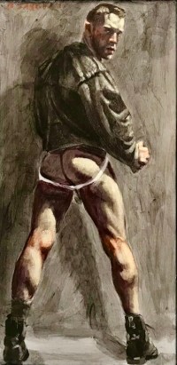 (Entirely unsuitable for kids and the sexually modest. Starting with the painting that set this posting off when it appeared in today’s Pinterest mailing for me. Which has a leather jacket, a jockstrap, boots, and an a in it; we’ll get to the d in the fourth and last painting in today’s series)