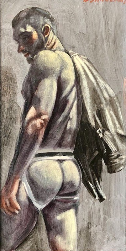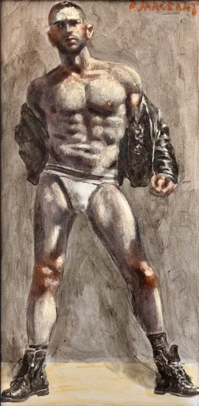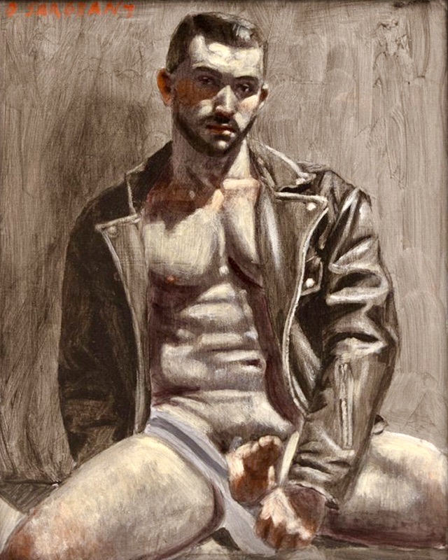 (Entirely unsuitable for kids and the sexually modest. Starting with the painting that set this posting off when it appeared in today’s Pinterest mailing for me. Which has a leather jacket, a jockstrap, boots, and an a in it; we’ll get to the d in the fourth and last painting in today’s series)