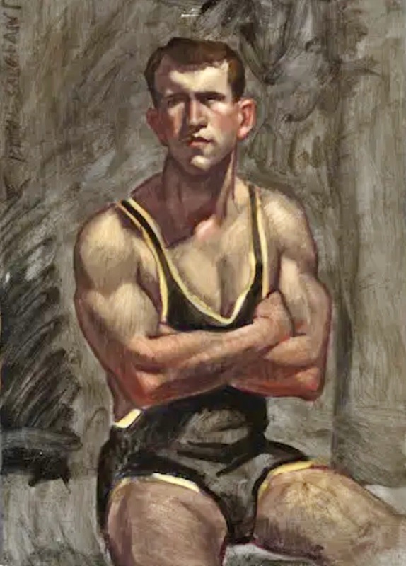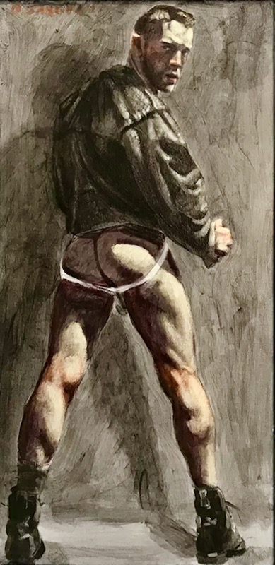 Pinterest has been offering me this painting every so often for a long time, but without any identification; today, I was finally intrigued enough by the tough and direct offer of the model’s muscular ass for sex to use Google Images to dig out the source. Who turned out to be an artist we’ve seen on this blog before, in my 7/18/23 posting “A homerotic painting by Bruce Sargeant” (the painting is Locker Room Scene — Charlie in Three States of Undress).