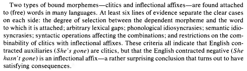 — to Q1: Two entirely serious linguists looked at characteristics of inflectional affixes and clitics and, to their surprise, found that n’t ended up solidly in the inflection column, so they published their evidence in a thoroughly respectable journal. I refer to: